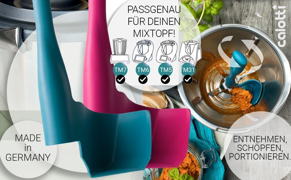 Aus diesen Gründen haben wir uns 2018 entschlossen, den Calotti® Drehkellenspatel zu entwickeln. Der Calotti® Drehkellenspatel passt genau zwischen die Messer und hat die gleiche Form wie die Mixtopfwand, zudem stützt sich Calotti® Drehkellenspatel auf der Achse des Rührwerks ab, wodurch man ihn einfach drehen kann. Dabei wird das Messer mitgedreht und der Calotti® Drehkellenspatel nimmt das Mixgut auf. Einfach calotti-flotti entnehmen!