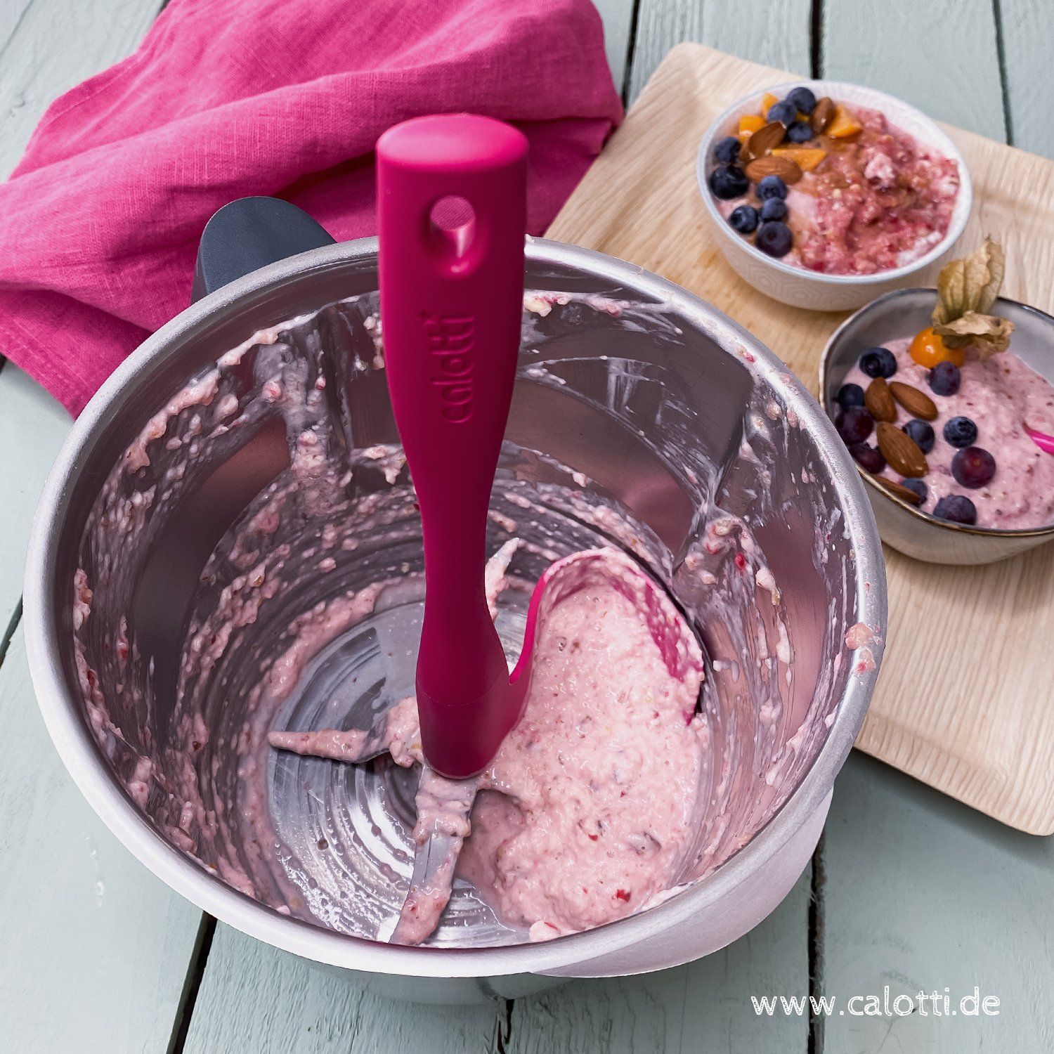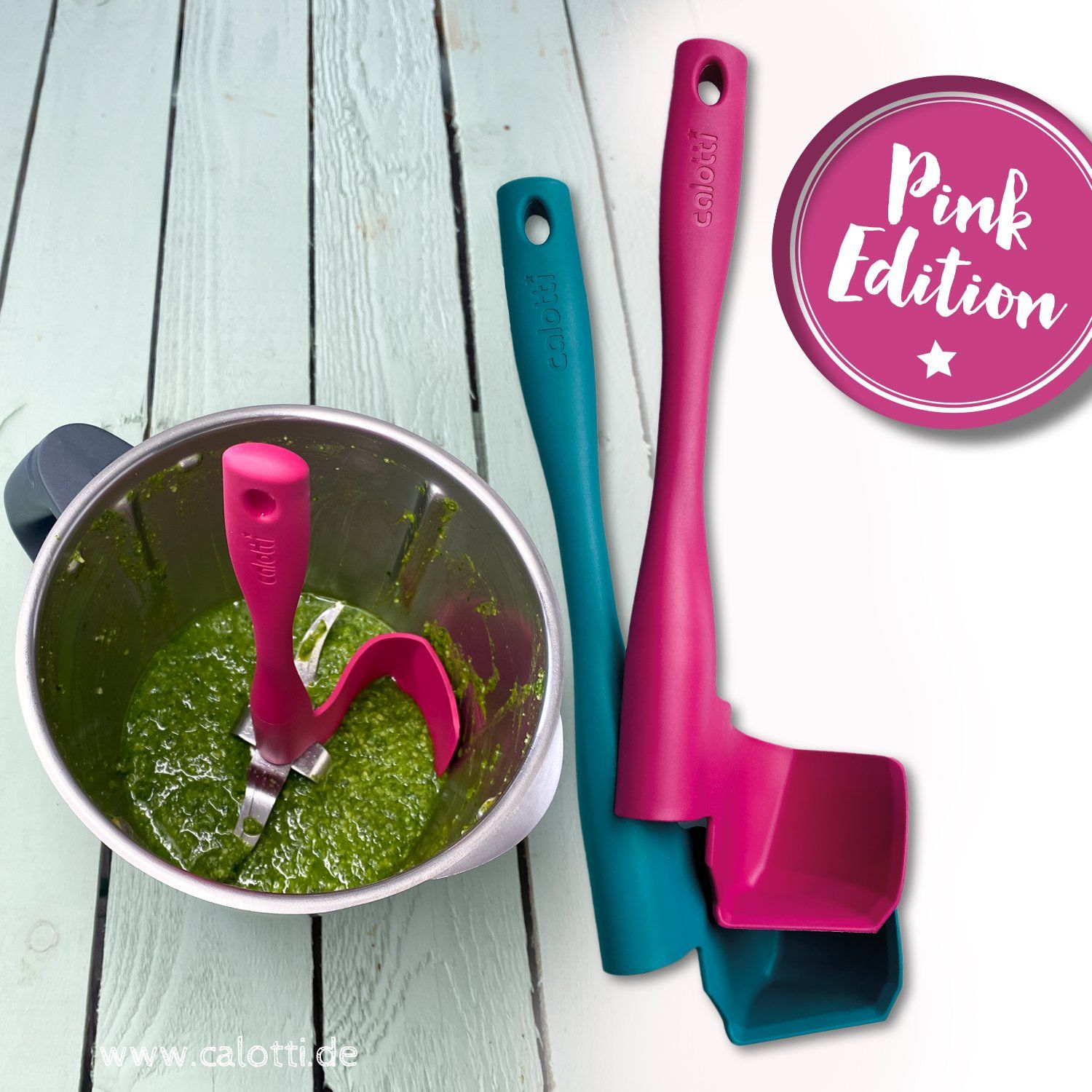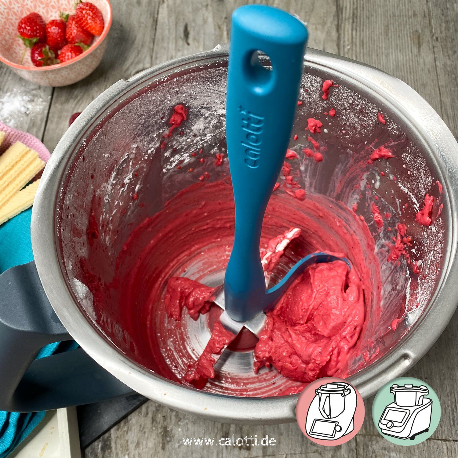 Pour ces raisons, nous avons décidé de développer le Calotti® en 2018. Le Calotti® s'insère exactement entre les couteaux et a la même forme que la paroi du bol de mixage.De plus, le Calotti® s'appuie sur l'axe de l'agitateur, ce qui facilite sa rotation. Le couteau est tourné en même temps et le Calotti® ramasse les aliments à mélanger. Retirez simplement les calotti flotti !