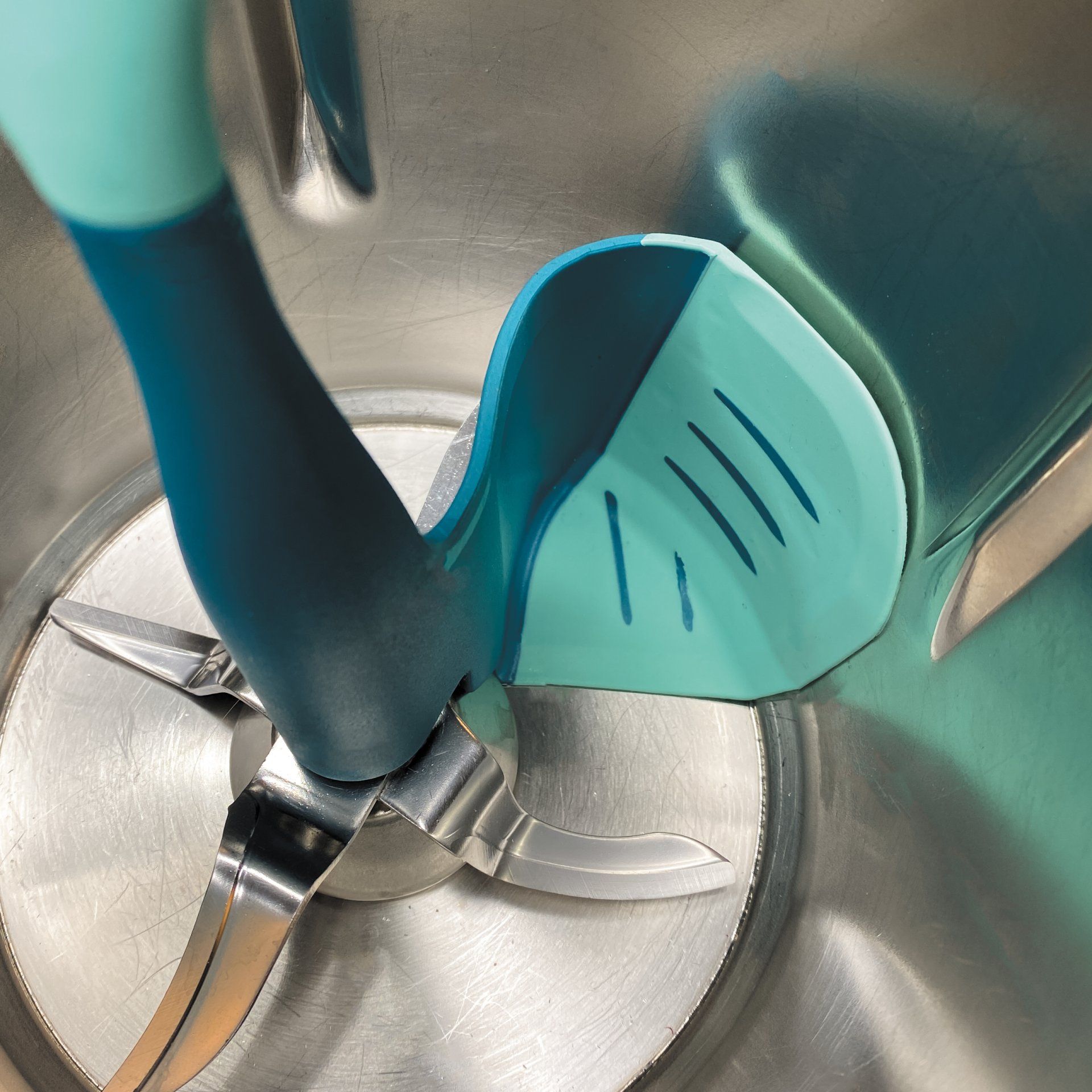 Per rimuovere, scavare e porzionare. La spatola rotante brevettata Calotti® Silicone si inserisce perfettamente tra il coltello e la parete del boccale e raccoglie il cibo da miscelare in un attimo grazie al lato flessibile in silicone.
