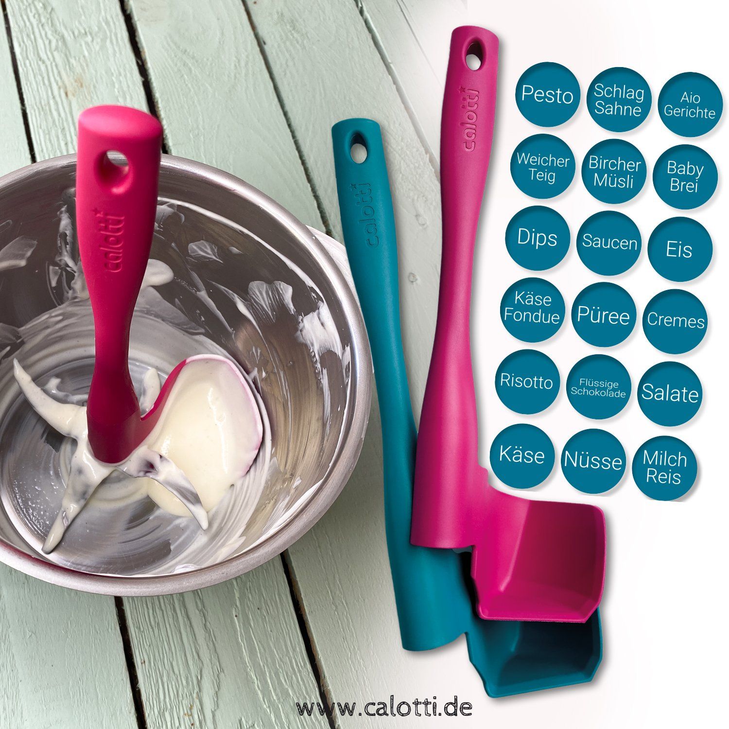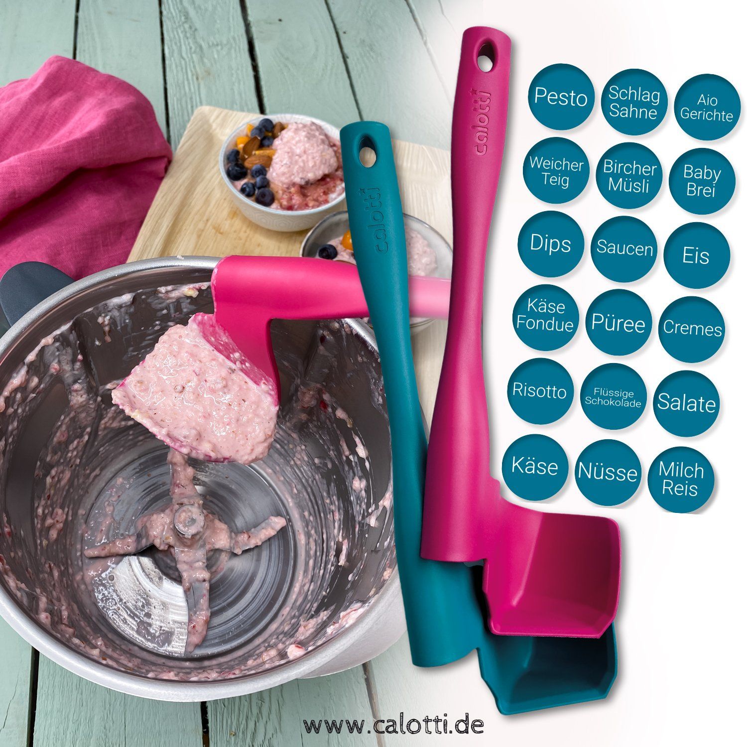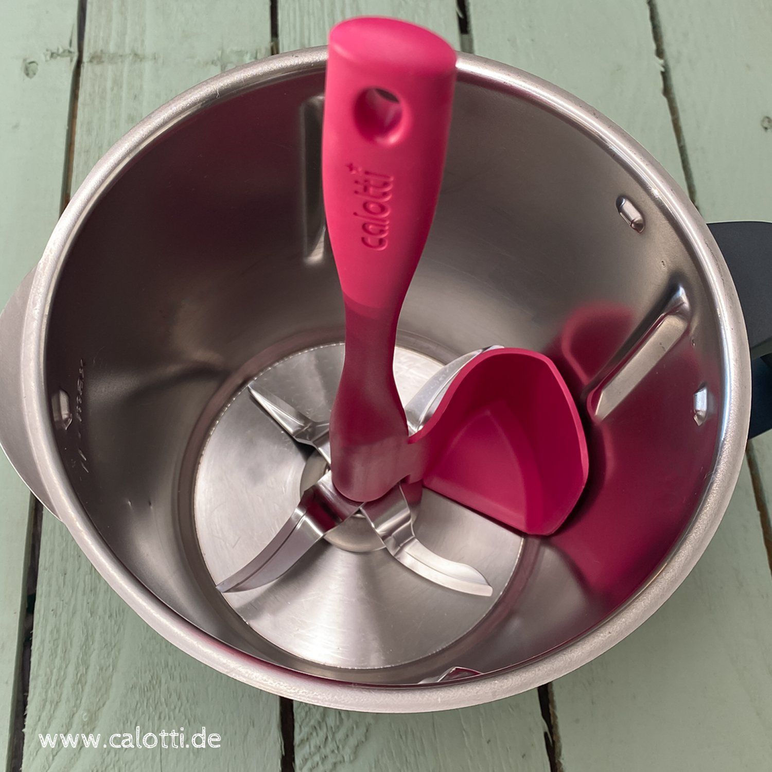 Pour ces raisons, nous avons décidé de développer le Calotti® en 2018. Le Calotti® s'insère exactement entre les couteaux et a la même forme que la paroi du bol de mixage.De plus, le Calotti® s'appuie sur l'axe de l'agitateur, ce qui facilite sa rotation. Le couteau est tourné en même temps et le Calotti® ramasse les aliments à mélanger. Retirez simplement les calotti flotti !